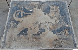 As I previously stated this mosaic and many similar to this can be found in Greece. Specifically, Delos, Greece. Delos is an island near to the center of Cyclades, which are an island group in the Aegan Sea. This area is found southeast of the mainland of Greece and is a former prefecture of Greece. This area of Greece contains a very high percentage of surviving mosaics from the Hellenistic period, containing just about half that remain. Some examples of other mosaics from this time period, in this area, are mosaics from the House of Dionysos. The reason all these mosaics could be found in Delos is largely due to the city’s importance during this time. Delos was one of the most sacred places in ancient Greece as well as one of the largest trade hubs. Its location was very advantageous for trade, being a middle area between the major commercial areas on the Aegan such as Athens, Corinth, Macedonia, etc.