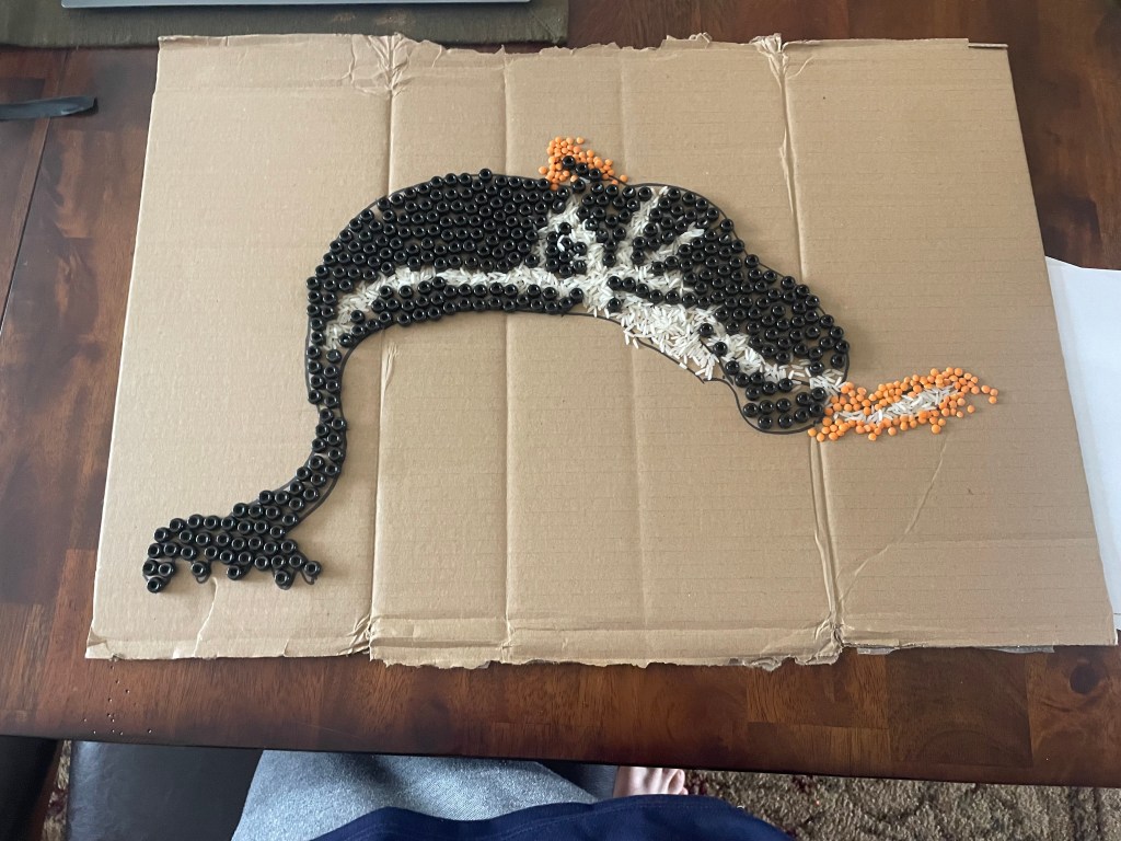 I laid down all the black beads first for one simple reason, the white ones hadn’t come in yet, and unfortunately, they weren’t going to make it in time. Because of this I had to adapt and decided to use rice. At first it may seem like rice would be much harder to use than beads, however as I started to lay it down, I realized I could just sprinkle rice in between the beads that were already down. This realization vastly cut down the time it took and, in my opinion, also helped with the look of the mosaic. My next step was adding red lentils. This was nowhere in my original plan, however when looking at the mosaic again I noticed a red outline around the nose and fin of the dolphin. These were hard to lay down due to the size but in the end, I think the addition of them definitely helped.